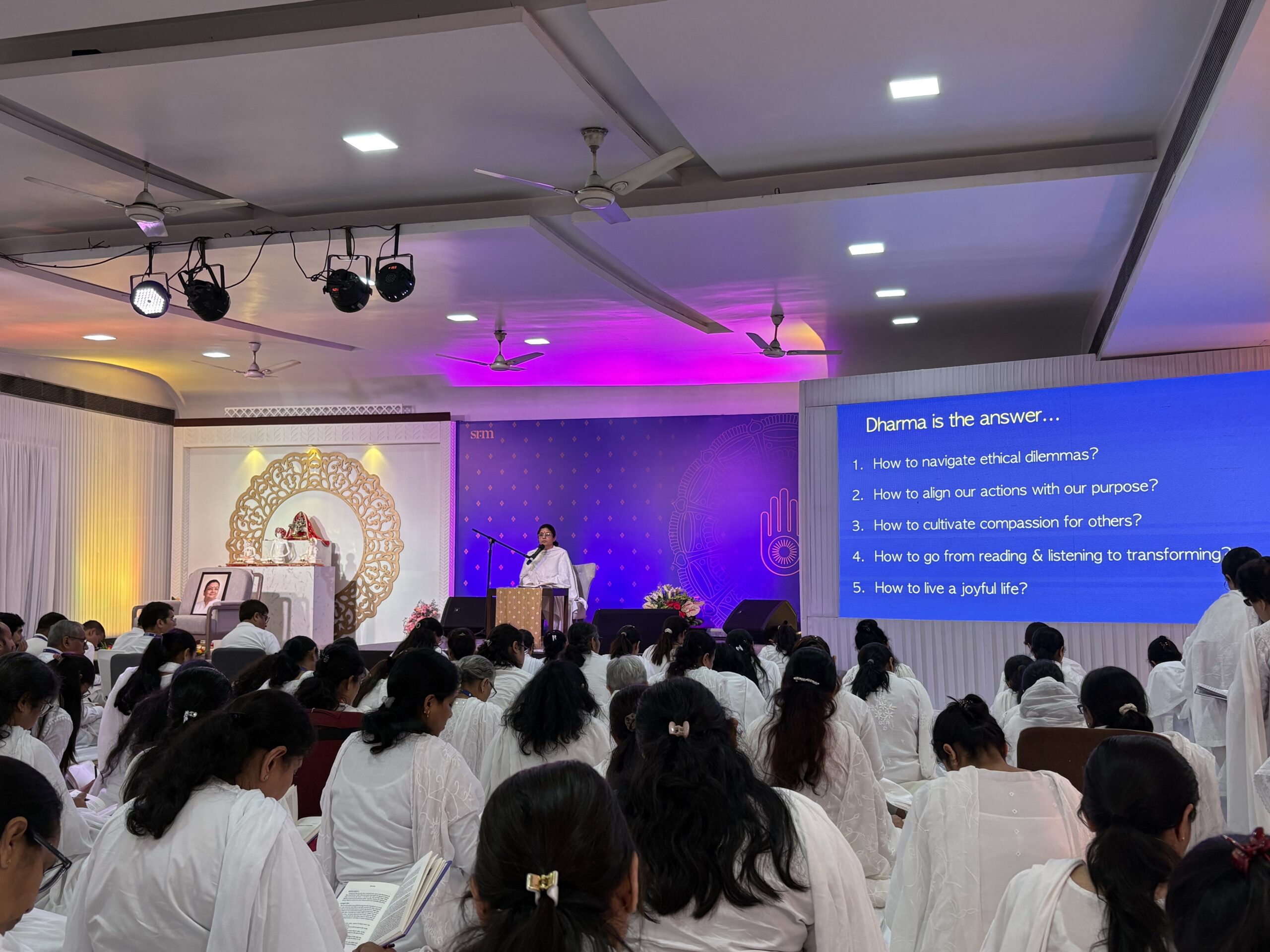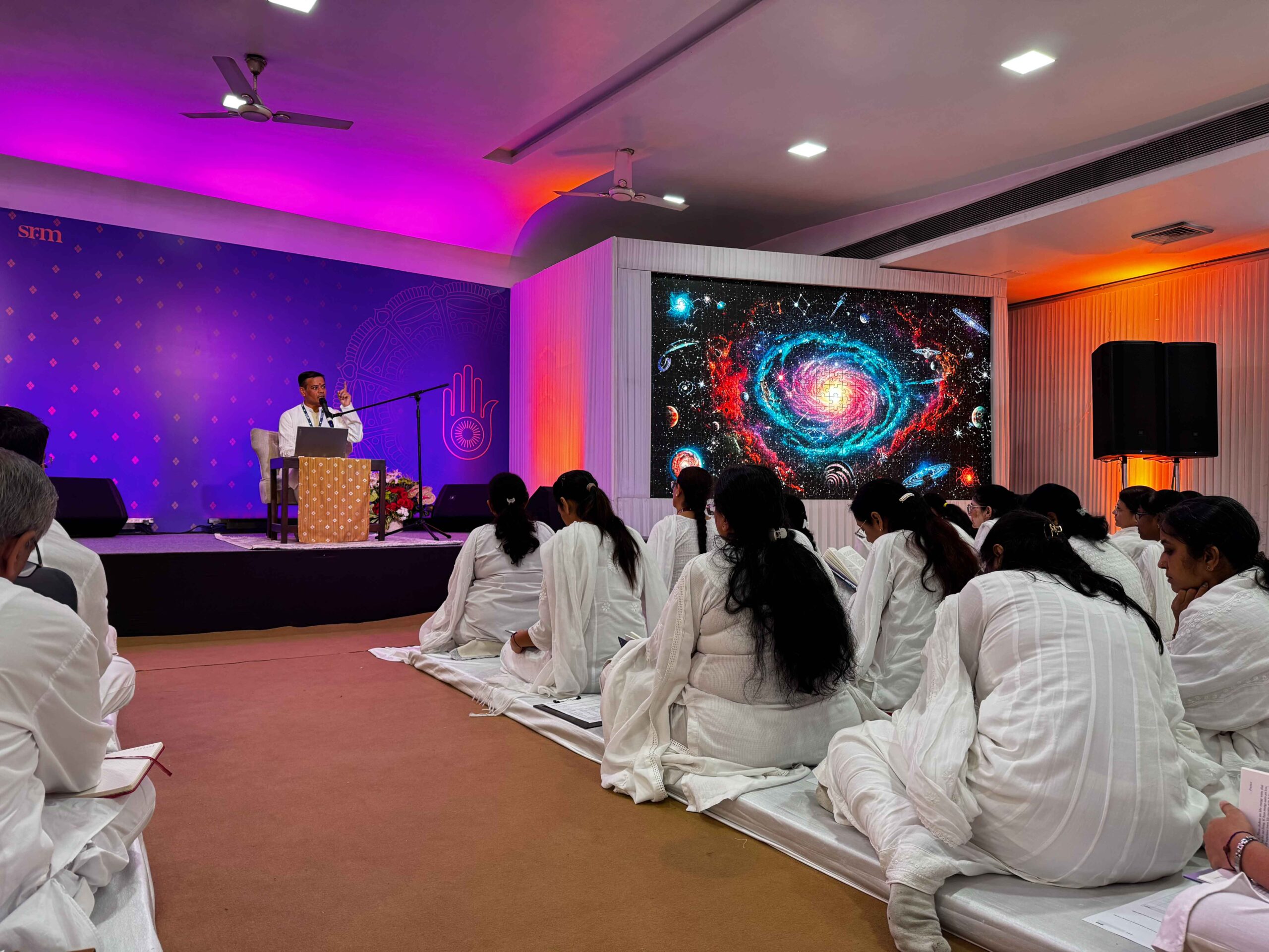 After any SRM retreat or major event, our editorial team enters into recollection mode to write the event report. This process requires an unspoken underlying assumption – there must be some key highlights to share with the seekers. But this Paryushan Parv presented a unique challenge: how do you find highlights when the entire event was an uninterrupted stream of trailblazing light? How do you ‘break’ this festival into ‘pieces’, when it was all about celebrating the canvas, the ultimate union?